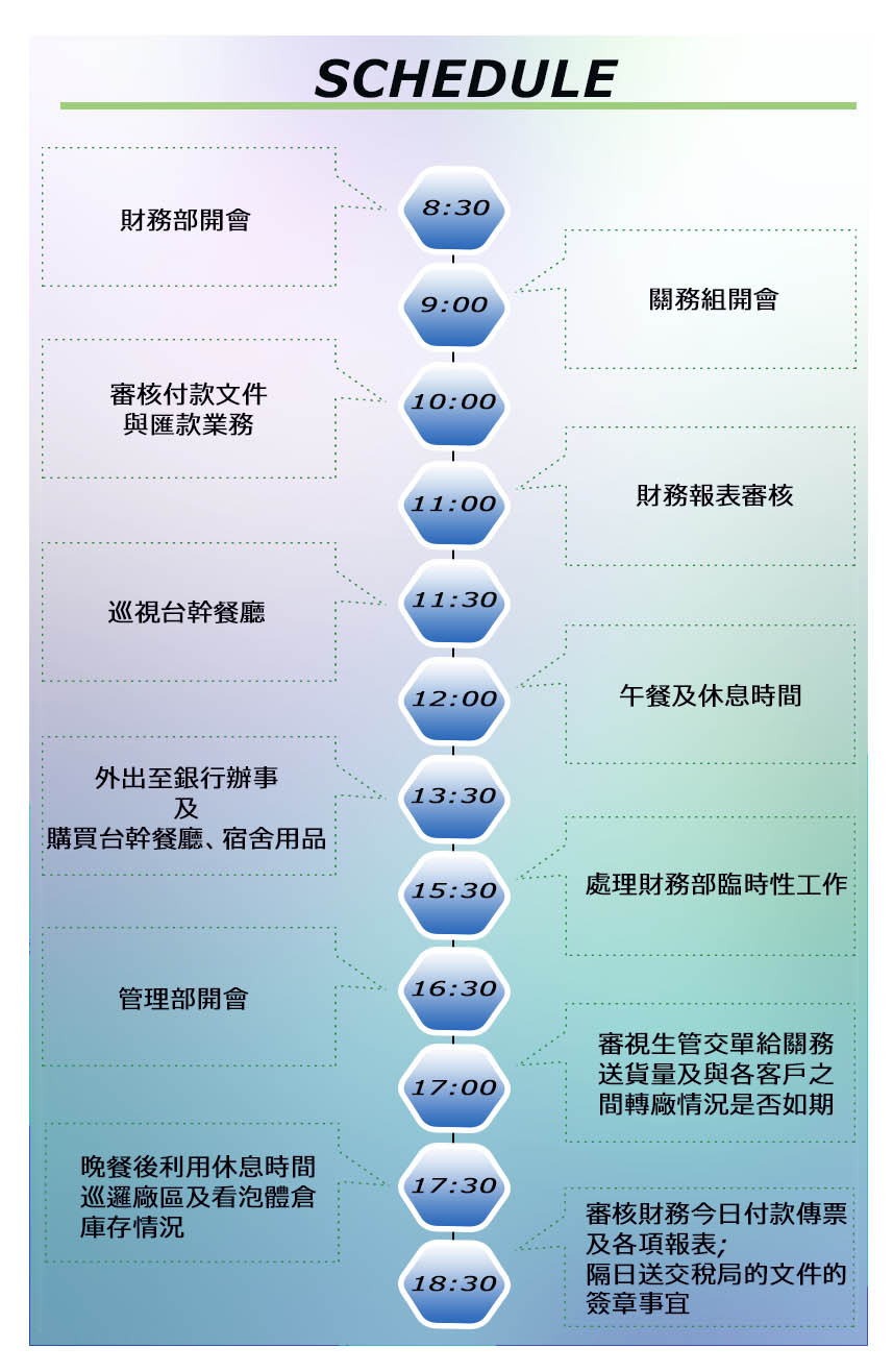 然而進入華慶,接觸的工作隨著年資的增加而工作範圍就更多元化。自身的角色被劃分在管理部而並非單純的財務部,可接觸到不同層面的員工,需要學習的事物也更多,雖然有的很煩但也有很有趣的一面,因為在這個崗位上要面對的人不像財務部單純,因此在待人處事上也可逐漸讓自己剛硬的個性隨著面對不同的人及單位而愈來愈柔軟。